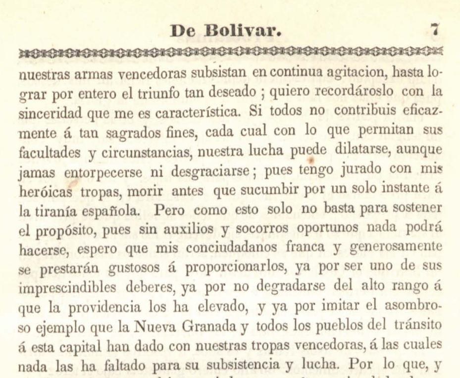 Proclama del 11 de agosto de 1813. p. 7. Bolívar, Simón. 1842. Proclamas del Libertador Simón Bolívar. Caracas: Imprenta de “El Venezolano” por M. J. Rivas.