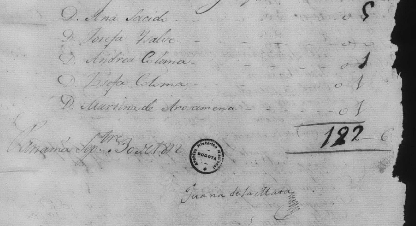 En una carta con fecha 6 de septiembre de 1812, el oficial real de Panamá, Ramón Díaz del Campo, recopiló los ofrecimientos de dinero hechos por varias señoras de la ciudad en una reunión que, según informaba, había tenido lugar el día anterior en la casa del gobernador. Las donaciones eran para acudir con vestuarios a las recién llegadas tropas de la Albuera venidas a Santa Marta para operar contra los insurgentes de Cartagena. En su carta, el oficial además listaba los nombres de ciertas mujeres que no habían hecho ofrecimiento alguno, ya fuera por encontrarse ausentes o por no haber sido aún requeridas a ello. Días después, el 30 de septiembre, Juana de la Mata, escribió al virrey Benito Pérez y presentó una nueva lista con las donaciones de aquellas mujeres faltantes en el original listado del oficial real de Panamá. Según anotó, ella se encargó de “reconvenir” para que así lo hicieran. Adicionalmente, incluía de parte suya una donación de seis vestuarios, la cual se sumaba a una anterior de cuatro.