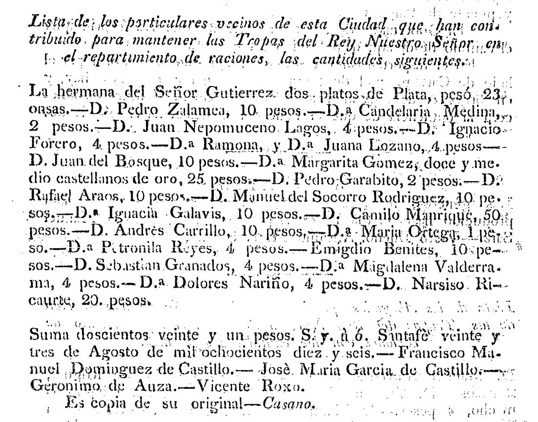 Una carta firmada por 50 mujeres de la provincia del Socorro en 1820, dirigida al señor gobernador y comandante general, permite señalar matices adicionales del acto de contribuir. La extensión de este documento no debe identificarse con insignificancia, pues la cantidad de mujeres firmantes y la rotundidad del lenguaje con que ellas expusieron la que llamaron su “ofrenda a la libertad” sin duda convence de todo lo contrario. Lo que primero salta a la vista en esta carta es la presentación de sus remitentes como “liberales”, con lo cual acentúan su disposición y comprometimiento para con la causa del nuevo gobierno. La carta se distingue de las demás de este apartado en tanto que el énfasis no se halla tanto en las razones de la contribución, sino más enérgicamente en aquello a que esta iba dirigida. Así, en las pocas líneas que la componen logran las mujeres del Socorro presentar un donativo al “Gobierno” y a sus “Conciudadanos” en forma de ofrenda a la libertad, que consideran sinónimo de bienestar de la patria.