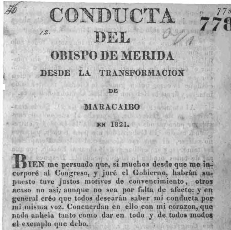 | Biblioteca Nacional de Colombia - Bogotá, FPD 275 PZA_11 | Conducta del obispo de Mérida desde la transformación de Maracaibo en 1821 | Relación | Independencia |