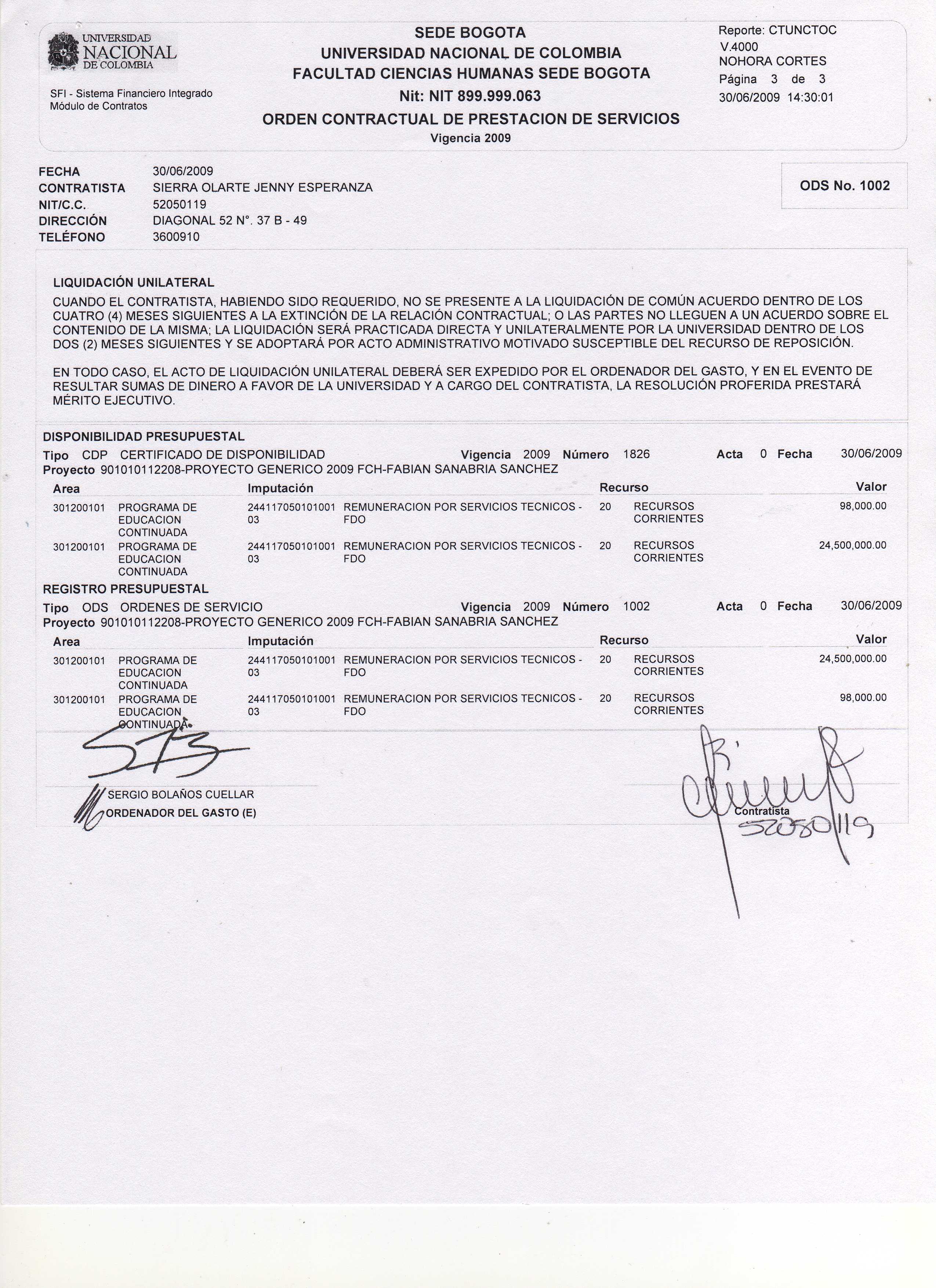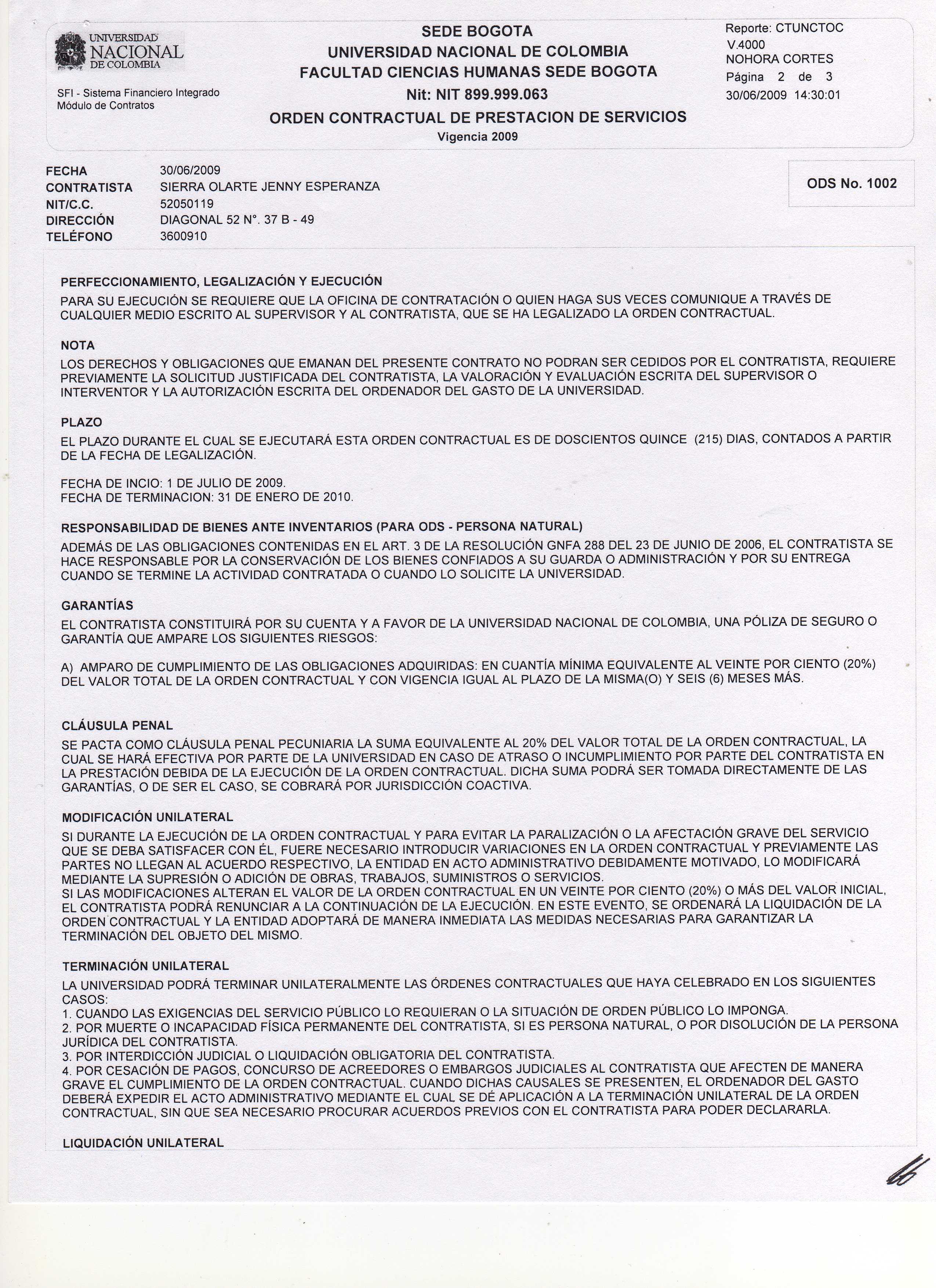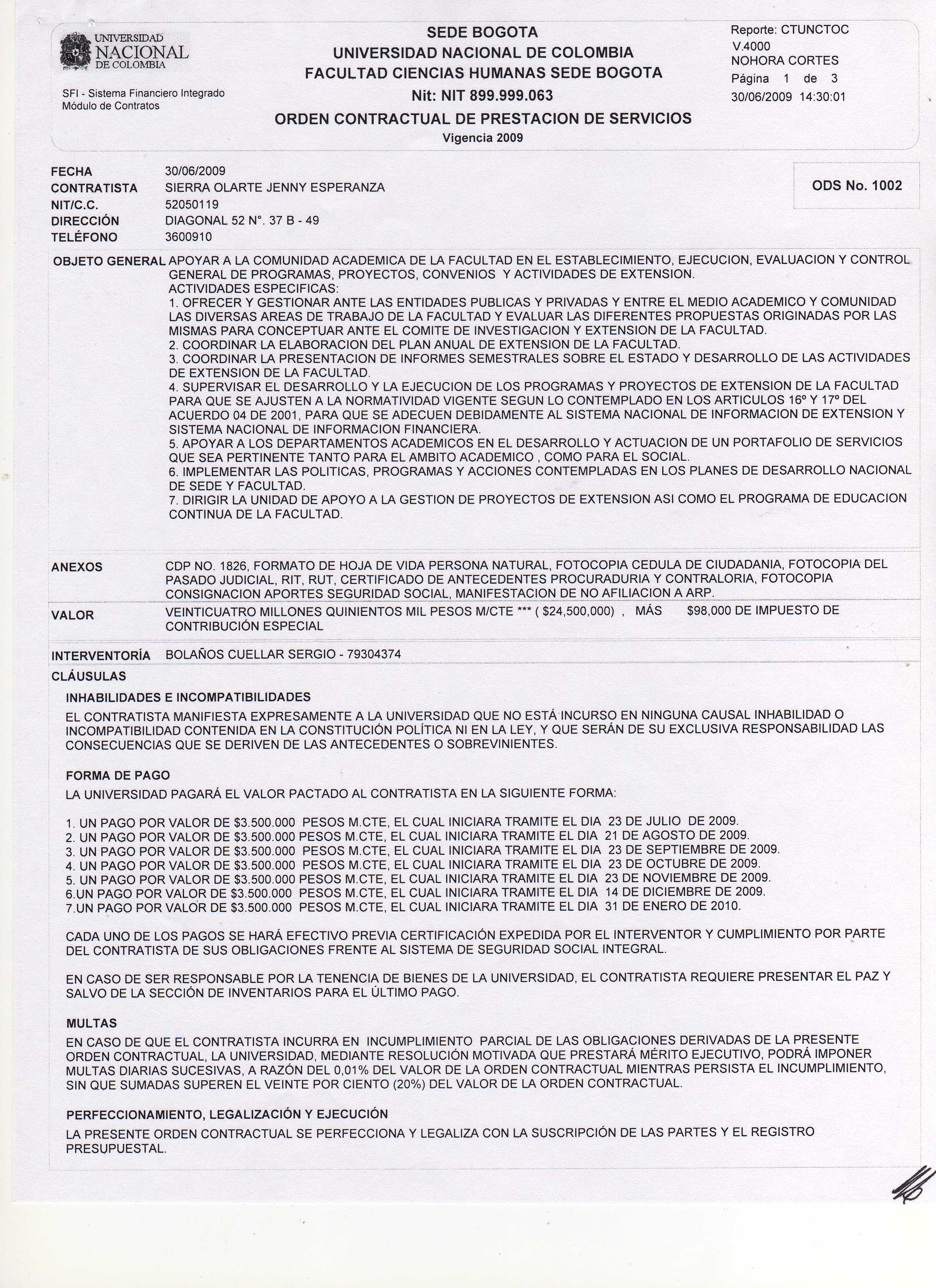 Objeto del contrato: Se realiza otro si a la ODC No 517 elaborada el 24 de noviembre de 2009, en el sentido de modificar la cláusula plazo, forma de pago y garantía, según solicitud mediante oficio D-FCH-536 suscrito por el profesor Fabián Sanabria.