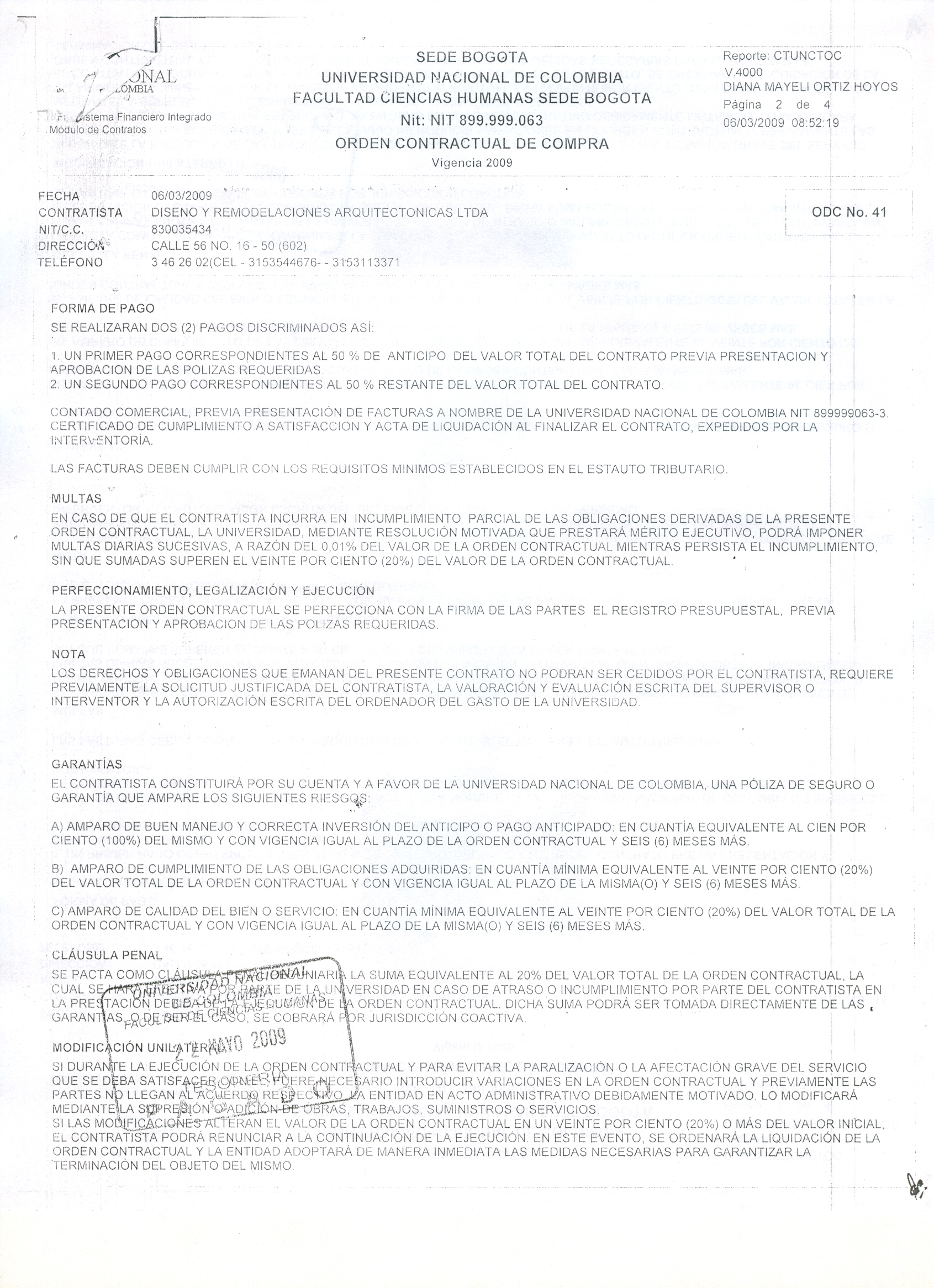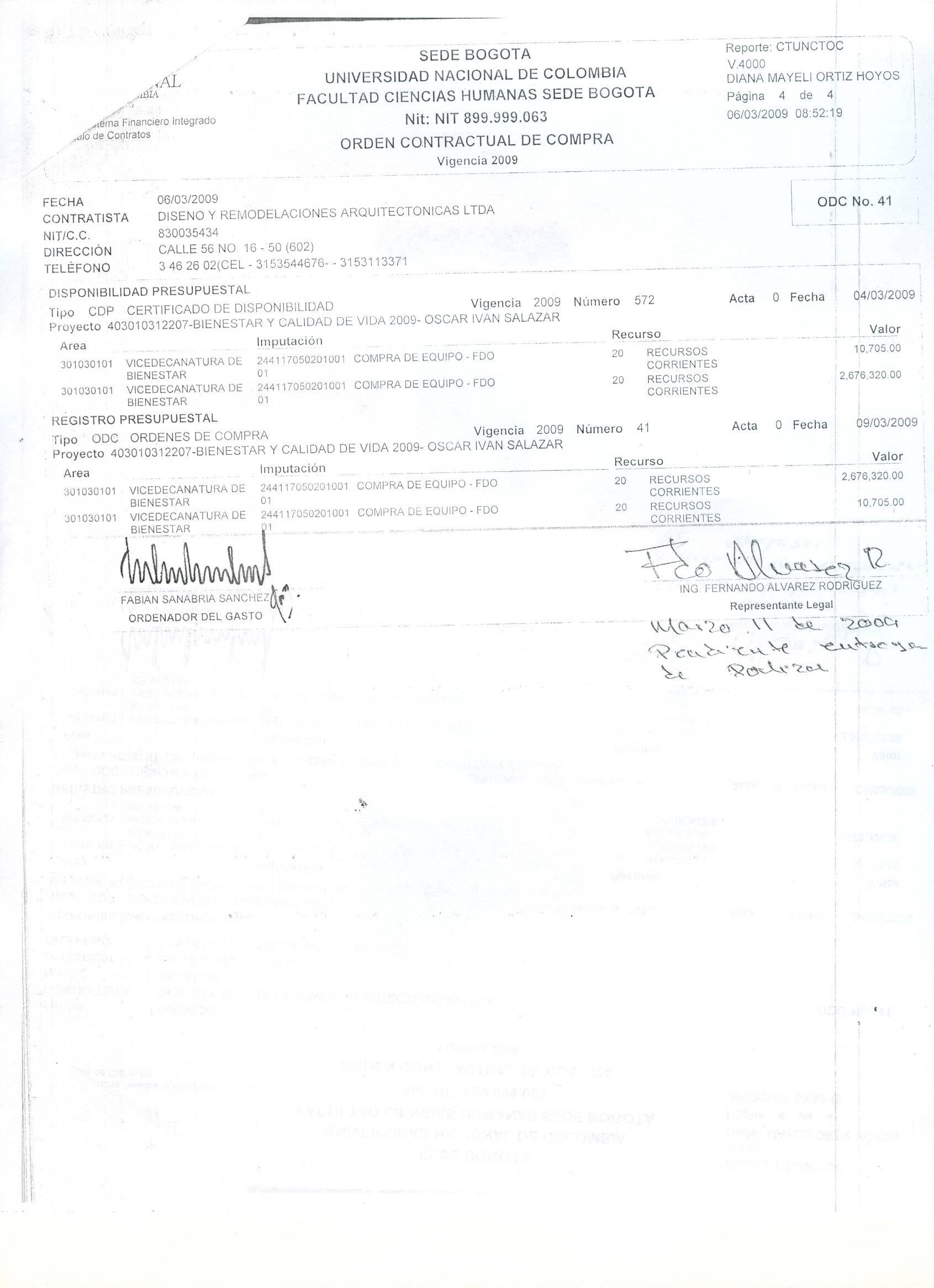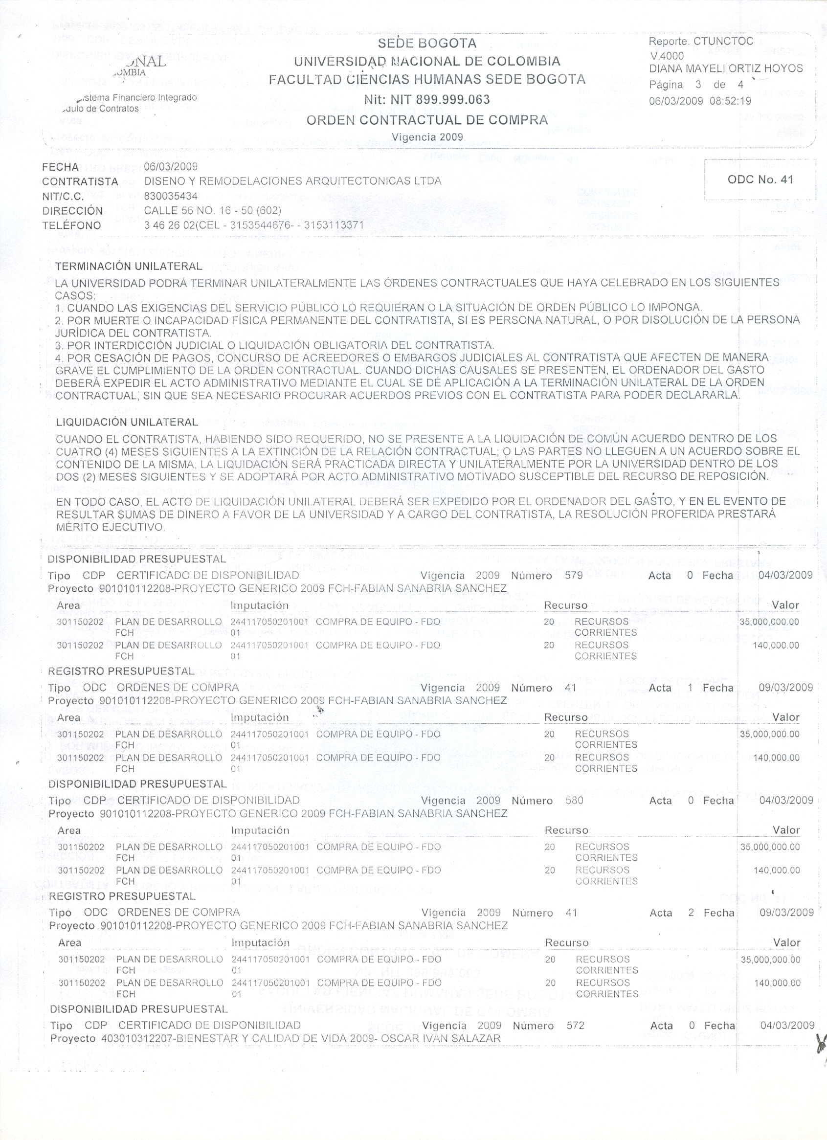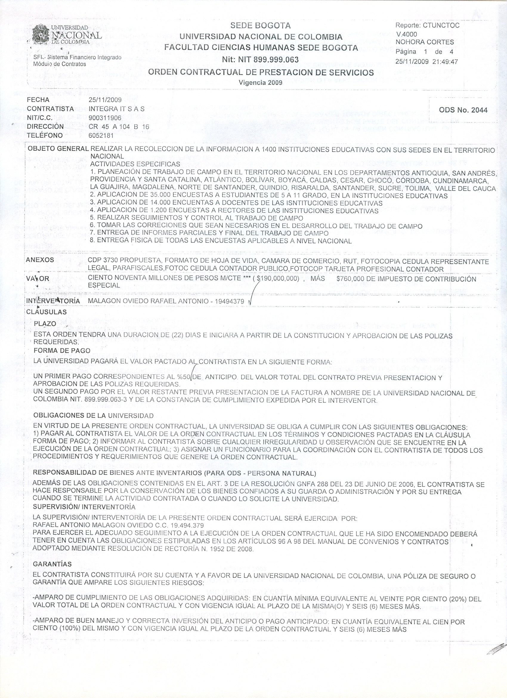 Objeto del contrato: Se realiza otro si a la ODC No 517 elaborada el 24 de noviembre de 2009, en el sentido de modificar la cláusula plazo, forma de pago y garantía, según solicitud mediante oficio D-FCH-536 suscrito por el profesor Fabián Sanabria.