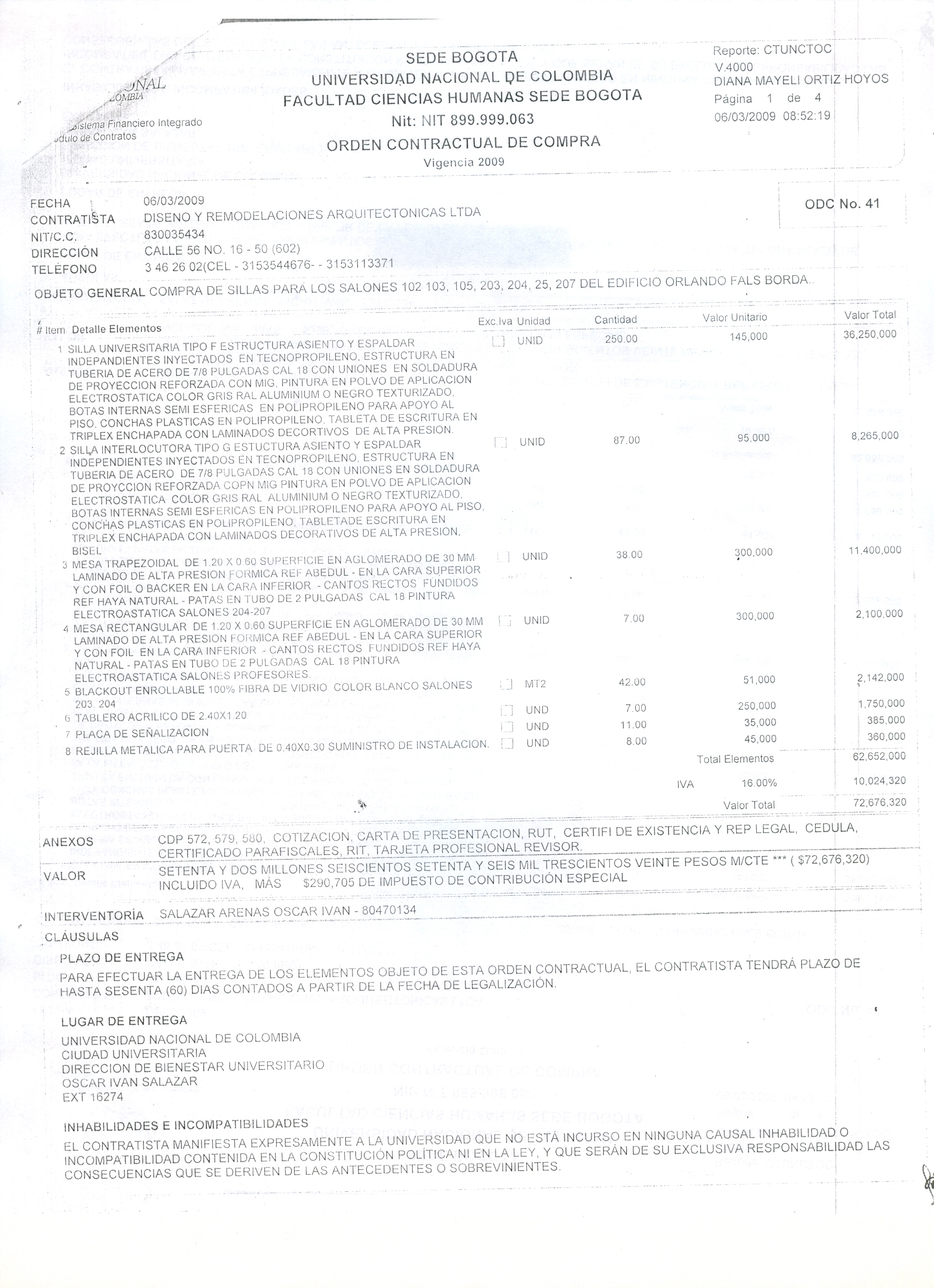 Objeto general: Compra de sillas para los salones 102, 103, 105, 203, 204, 205 y 207 del edificio Orlando Fals Borda.