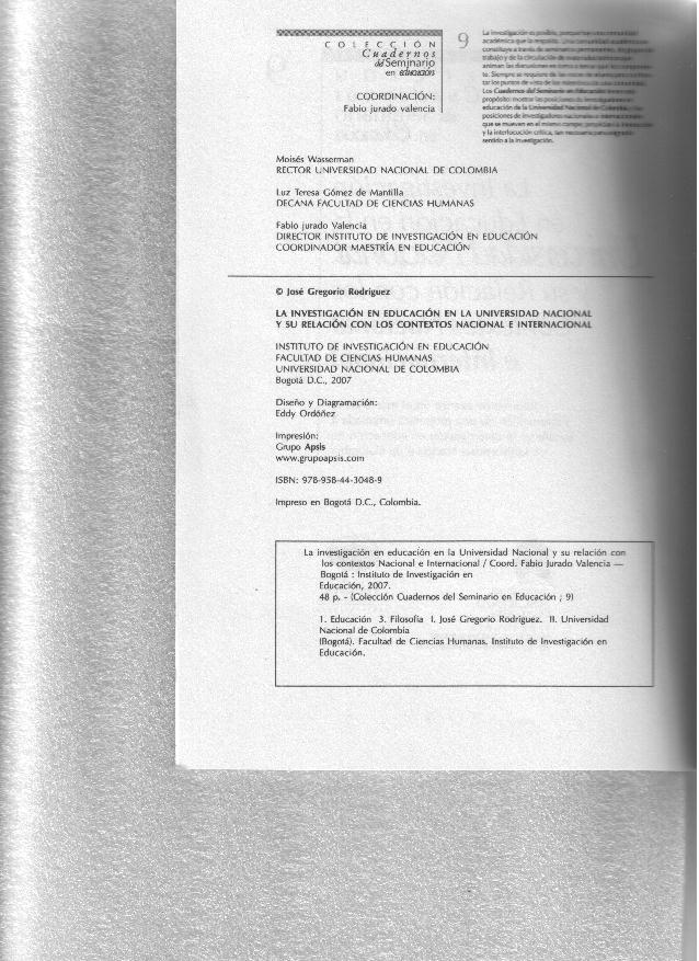 - RODRÍGUEZ, José Gregorio. (2007). La investigación en educación en la Universidad Nacional y su relación con los contextos nacional e internacional. Ed. Universidad Nacional de Colombia, Instituto de Investigación en Educación. Colombia.